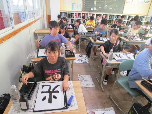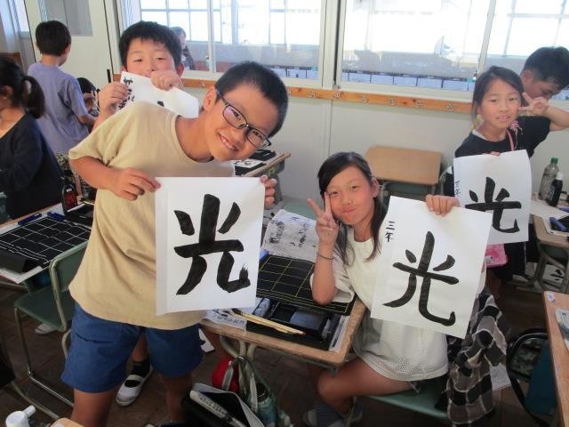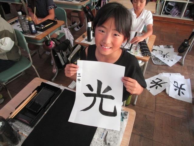 3年生が書写で「曲がり」の練習をしていました。今回は、「光」という文字を書きます。曲がる所やはねる所に気を付けて書きました。