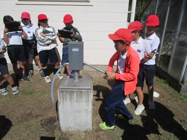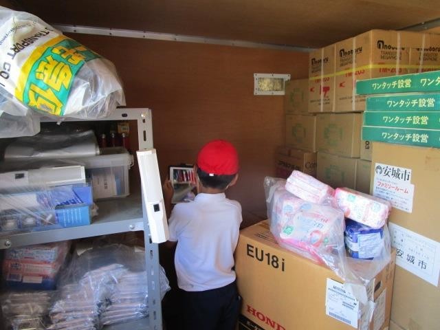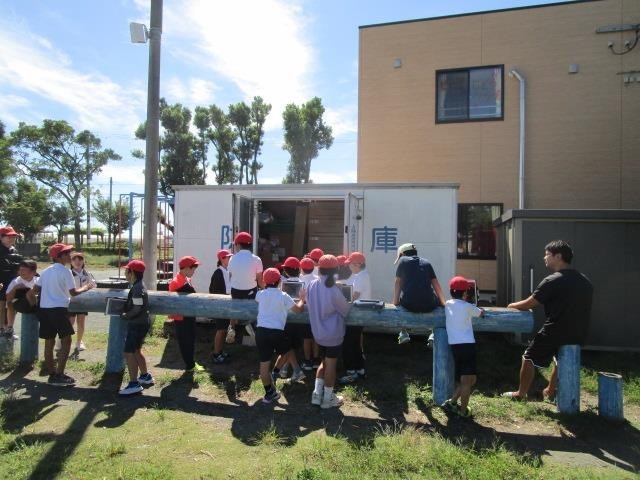 4年生が社会の授業で、防災倉庫の中を見学していました。防災倉庫には、災害に備えていろいろな物品が入っています。どんな物があるか調べました。また、非常用のポンプから水を出す体験もしました。