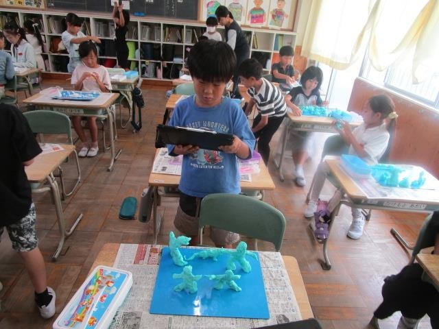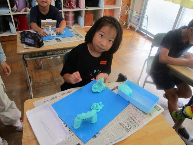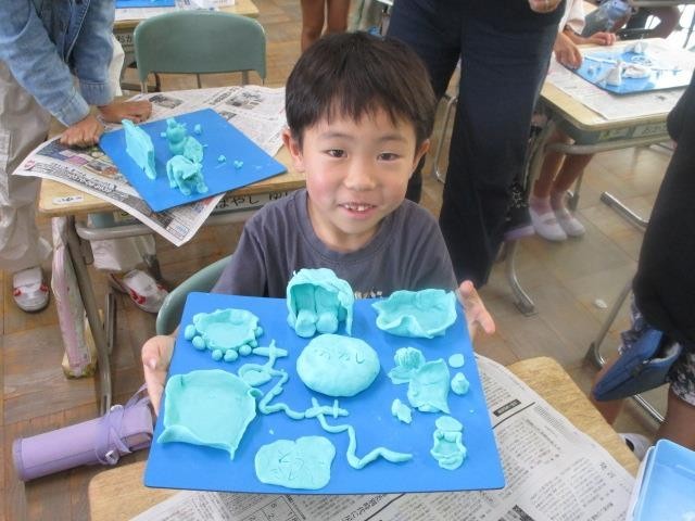 2年生が図工で粘土の作品を作りました。今回のテーマは、「理想のまち」です。こんなまちがあったらいいな、という思いがこもっています。