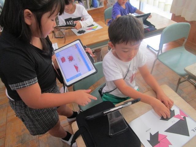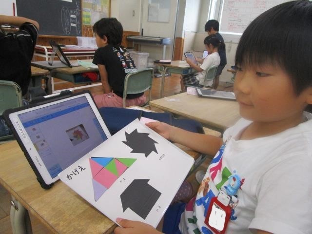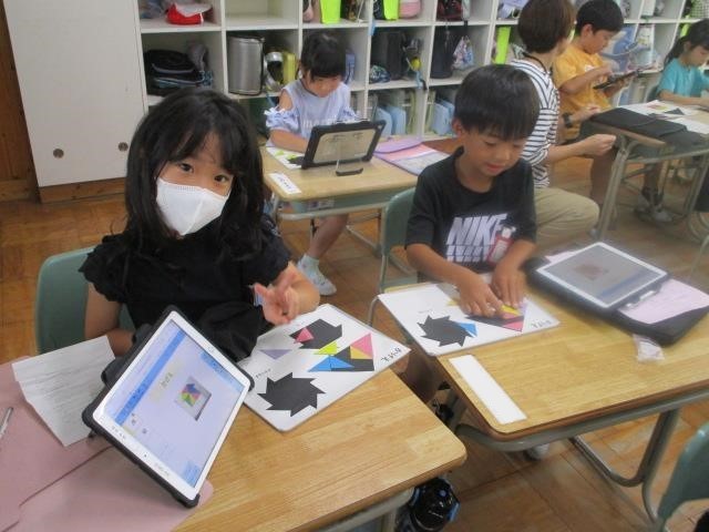 1年生が算数で、色板を使った形づくりに取り組んでいました。影絵を見て、どのように色板を置くと同じ形ができるか、試行錯誤しながら考えました。