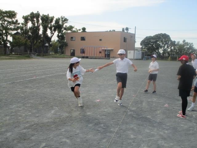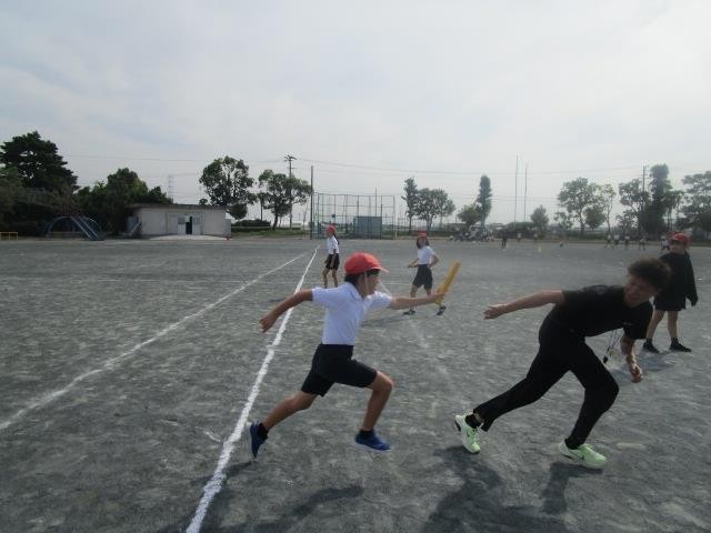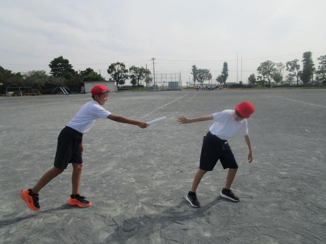 6年生が体育でリレーの練習をしていました。バトンを素早く渡せるよう、何度も受け渡しの練習をしていました。
