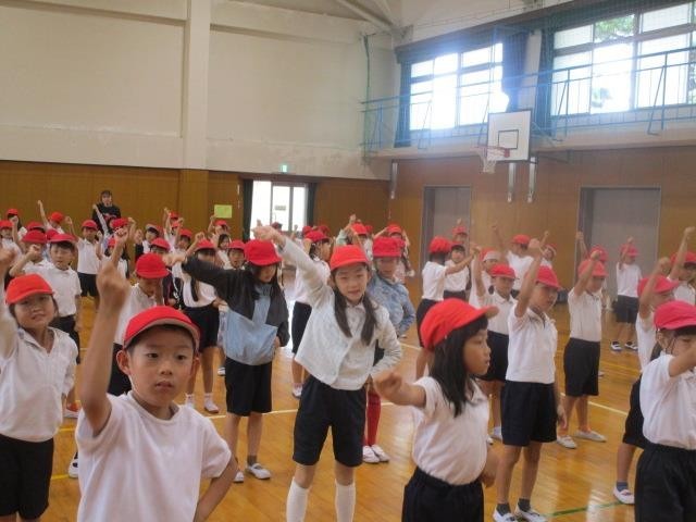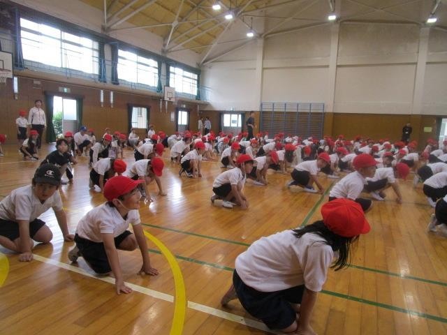 今日から運動会の練習が本格的に始まりました。1・2年生は、体育館で踊りの練習をしました。ポーズやかけ声のタイミングについて説明を聞いて、元気よく体を動かしていました。