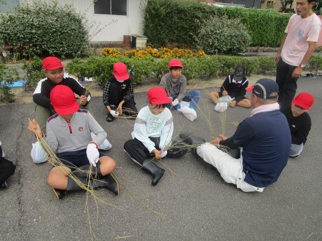 5年生のみんなで力を合わせて、田んぼの稲を全て刈り取りました。お米がたくさんできているといいですね。藁を使って、菅縄の作り方も教えていただきました。