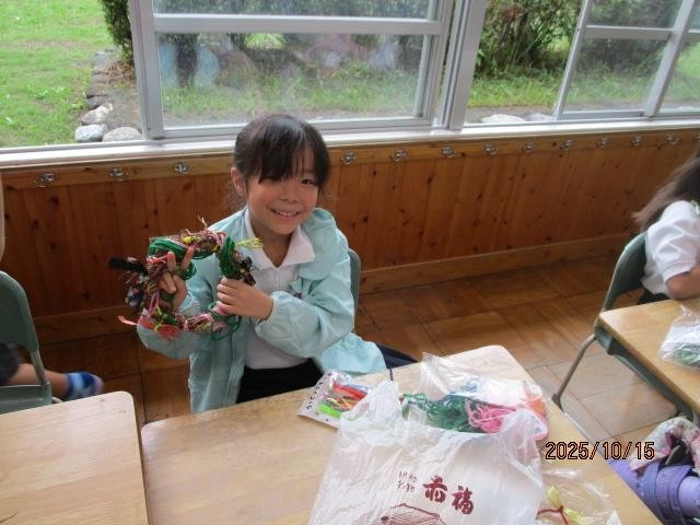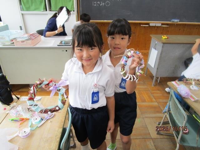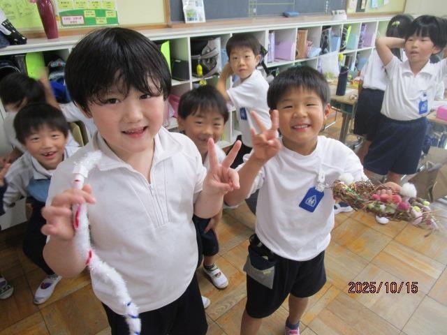 1年生が、アサガオで作ったリースに飾りをつけていました。どんぐりや松ぼっくり、リボンなどを使って思い思いに飾りつけました。