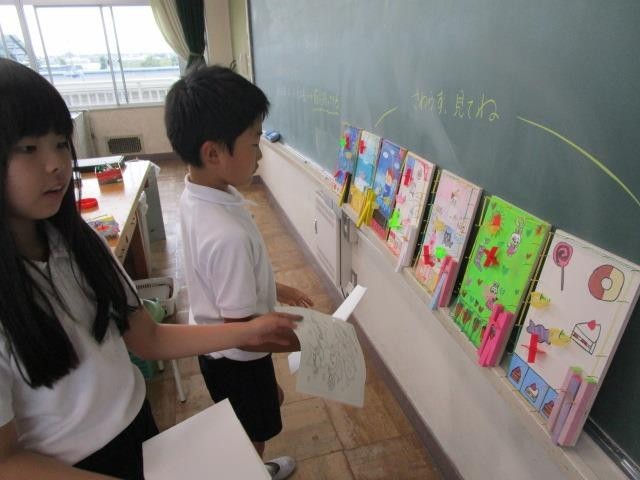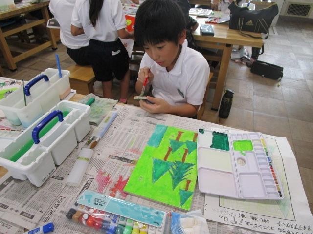 3年生が図画工作で木の板に絵を描いていました。乾いたら釘を打ったり部品を取り付けたりして、ビー玉で遊べる作品が出来上がります。金槌の使い方や釘の打ち方を学習します。