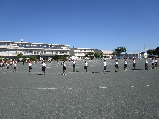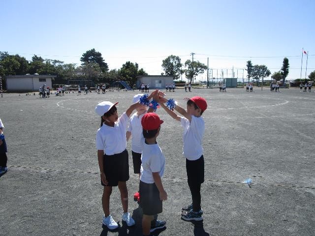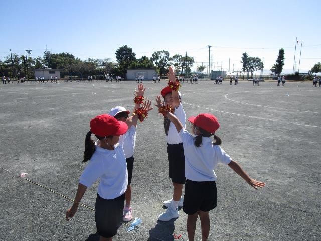 1・2年生が外で運動会の練習をしていました。今日は、きらきらのバンドを手首につけました。手をピンと伸ばして、格好よく踊っていました。