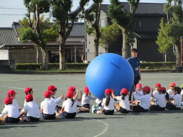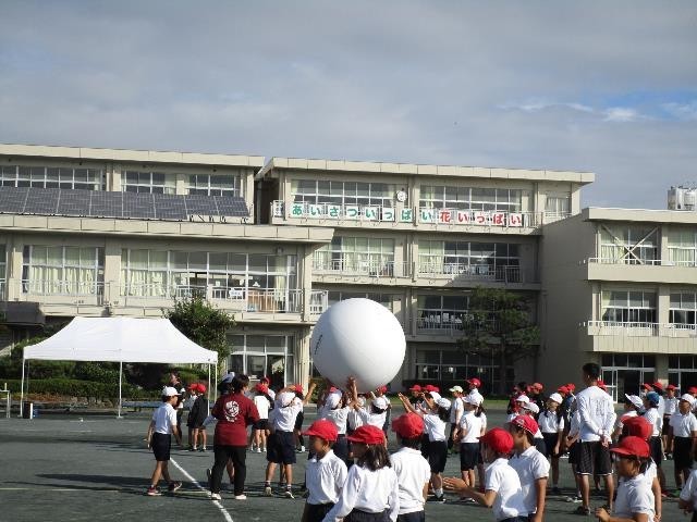 今日は、全校競技「大玉送り」の練習をしました。赤、青、白の3チームに分かれ、大玉を送る速さを競います。まっすぐ玉が進むよう、力を合わせてがんばりました。