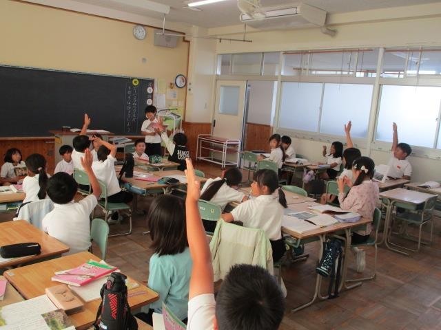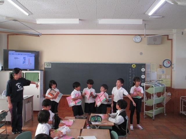 2年生は、国語で「ビーバーの大工事」を学習しています。説明文をもとに、動物クイズを作り、出題したり答えたりしていました。