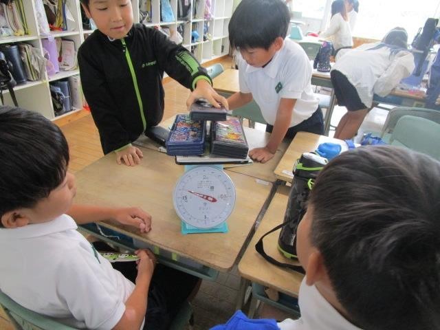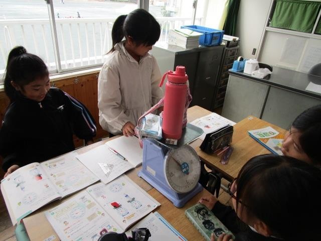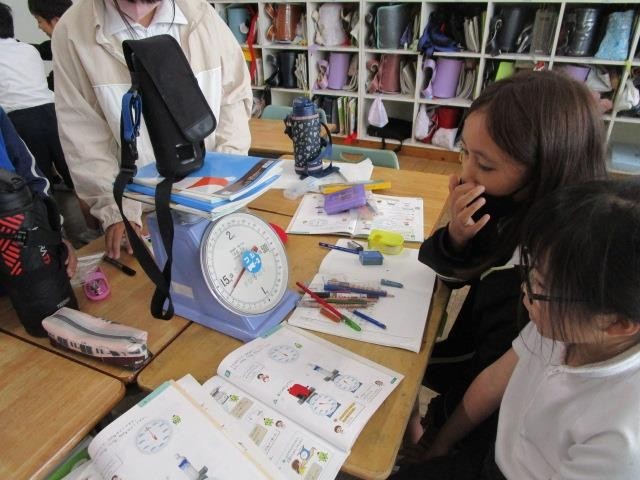 3年生が算数で重さの学習をしていました。身近にある物の重さを予想し、はかりを使って計測しました。少しずつ目盛りの読み方に慣れてきました。