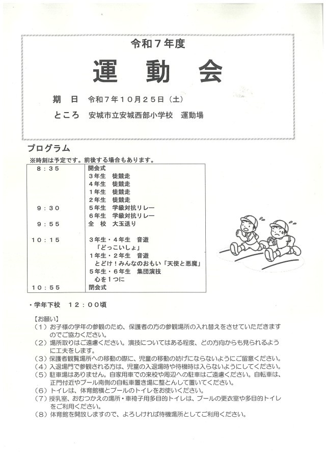 本日の運動会は、予定通り実施いたします。よろしくお願いいたします。