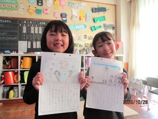 1年生が運動会の思い出を絵や文章でかいていました。徒競走や踊り、大玉送りなど、自分の一番の思い出をかきました。