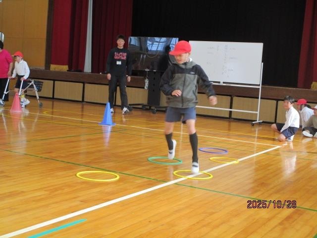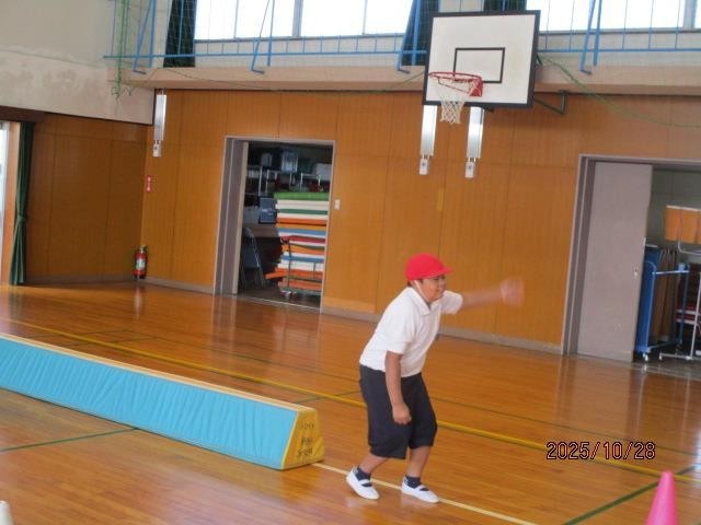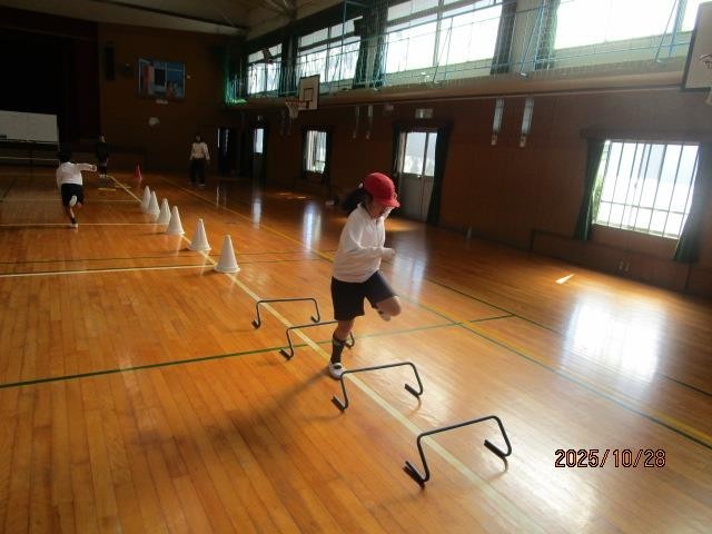 たんぽぽ組のみなさんが、体育館でいろいろな動きの練習をしていました。細い道幅の所を通ったり、小さなハードルをまたぎ越したりして、いろいろな動きが素早くできるようにがんばりました。