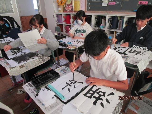 6年生が毛筆で「湖」という文字を書いていました。文字の組み立てに気を付け、手本を見ながら真剣に書いていました。