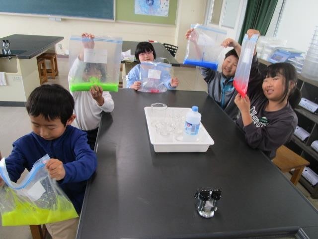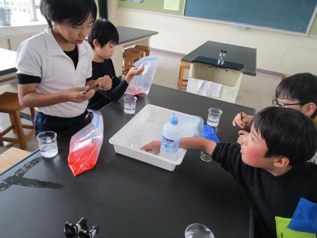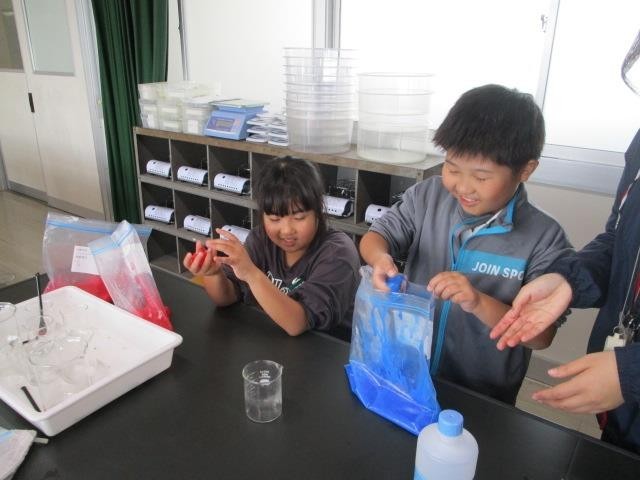 たんぽぽ学級は、理科の時間にスライムをつくりました。薬品や絵の具をビニール袋に入れ、しっかりとかき混ぜると完成です。直接さわると、ひんやりして気持ちがいいです。