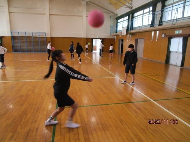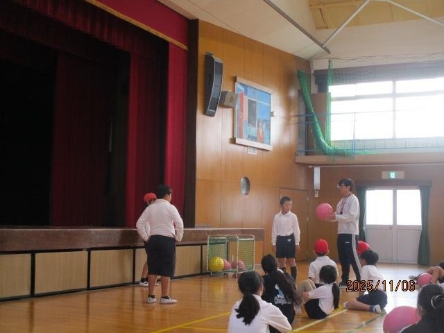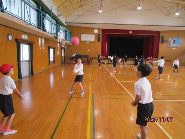 5年生が体育館でソフトバレーボールをしていました。ボールを受け、上手に相手に返す練習に取り組みました。