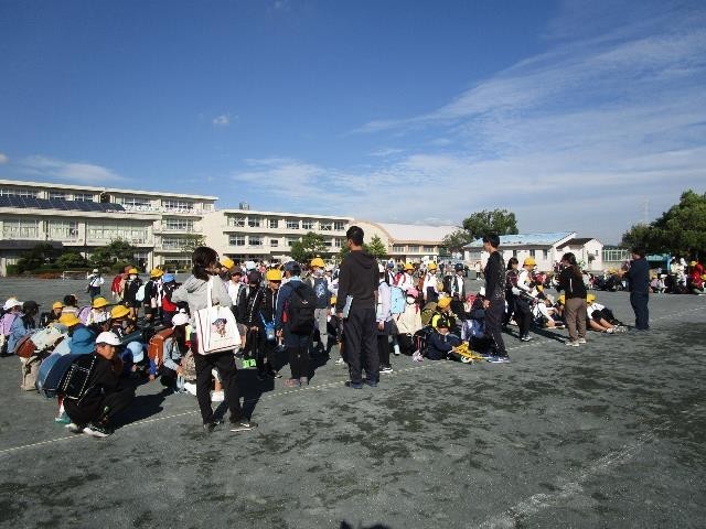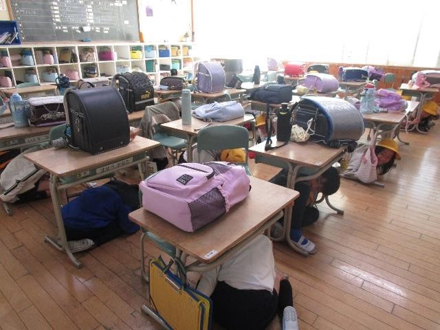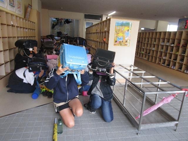 今日は、下校時に大きな地震が起こったことを想定し、避難訓練を行いました。避難する途中で余震が起こることも考えられるので、大きな揺れが起きたらすぐに低い体勢になって身を守る訓練をしました。