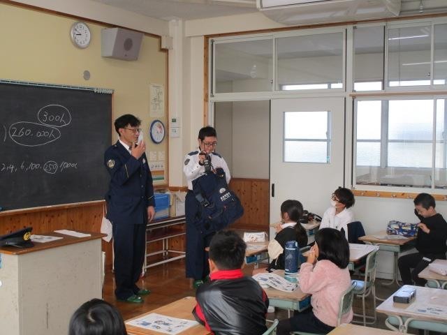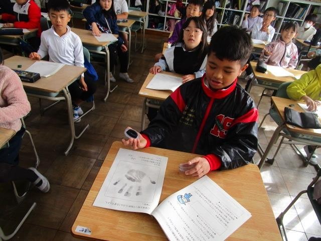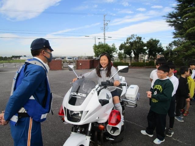 今日は、警察署の方が来校され、3年生に向けて警察の仕事や市民の安全を守るためにしていることについてお話をしてくださいました。指紋を取る体験や白バイ・パトカーに乗る体験もさせていただきました。警察の仕事に興味をもった子がたくさんいたようです。