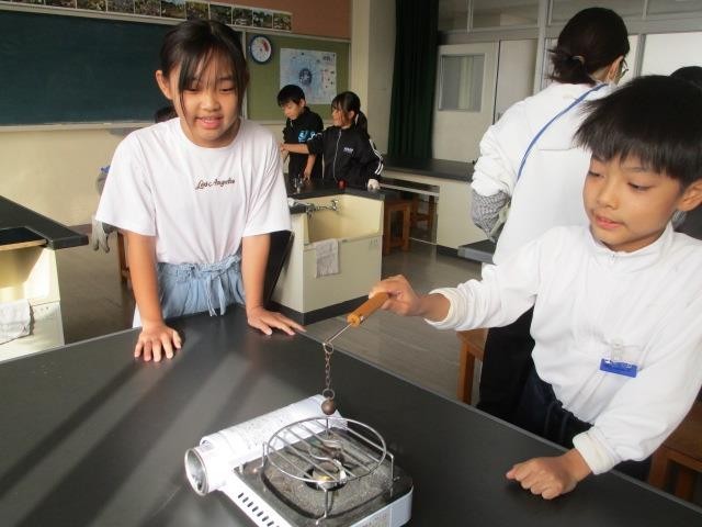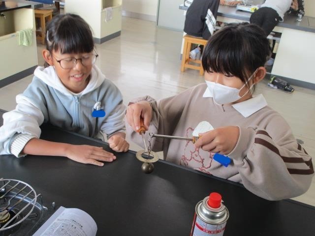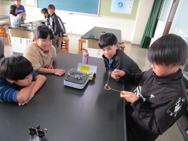 4年生が理科の学習で「金属を熱すると、体積は変わるのか」について考え、実験をして確かめました。はじめは、輪を通り抜けた鉄球が、熱すると通り抜けなくなりました。自分たちで鉄球を熱して確かめ、納得した様子でした。
