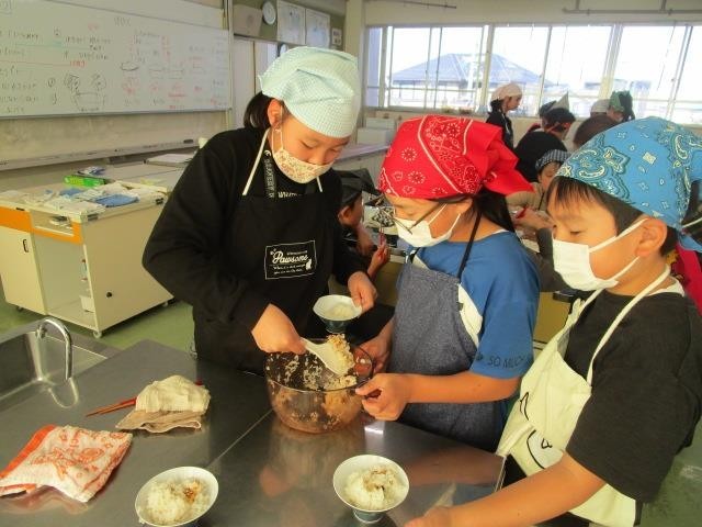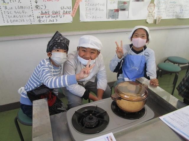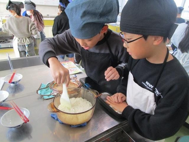 5年生が、家庭科で炊飯を行いました。自分たちで稲刈りをして収穫した米を使い、鍋で炊きました。とても美味しそうにできました。