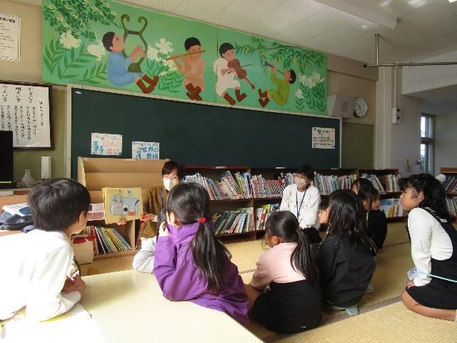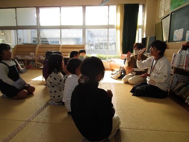 今日は、休み時間に読み聞かせがありました。はじめに、楽しい手遊びを教えていただきました。次に、絵本を読んでいただきました。小さい鍋と大きい鍋の話、クジラの話の2つでした。絵本の部屋に集まった子たちが、一生懸命聞いていました。