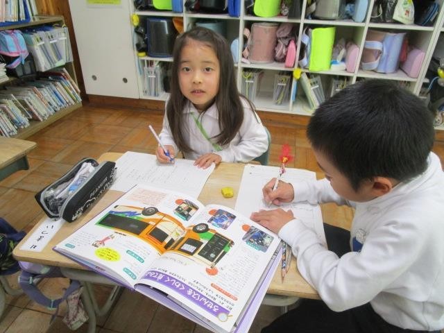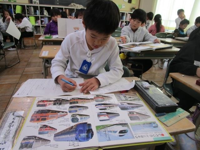 1年生が国語で「のりもの調べ」をしていました。自分が興味をもった乗り物の特徴を図鑑で調べ、紹介できるようにまとめていました。