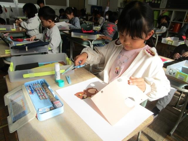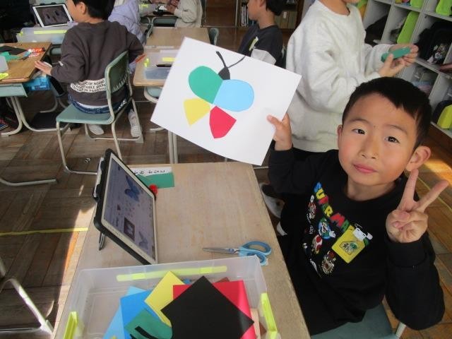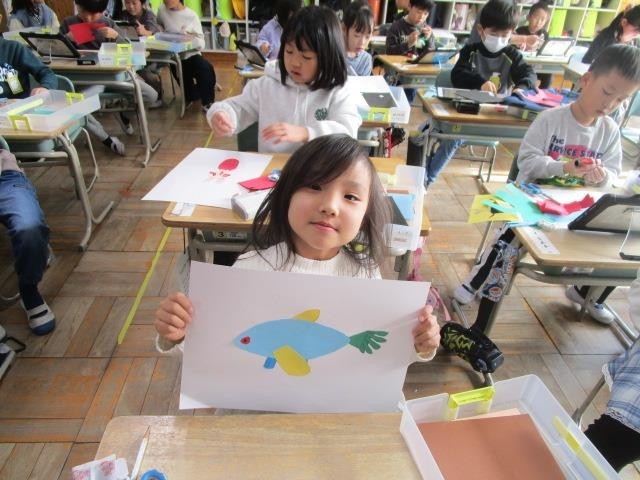 1年生が図画工作で版画に取り組んでいました。「進化した生き物」をテーマに想像を広げ、カラーのシールを貼り付けて版を作りました。
