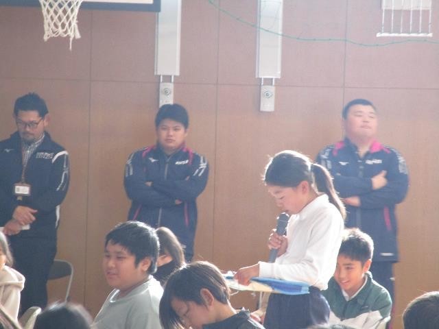 実技の後は、選手の方のお話を聞きました。競技を始めたきっかけ、うれしかったことや大変だったこと、どんな思いで競技を続けてきたか、これからの目標や夢など、たくさん語っていただきました。そして、子どもたちに向けて、夢や目標をもち、今できることを頑張ってほしいというメッセージをいただきました。