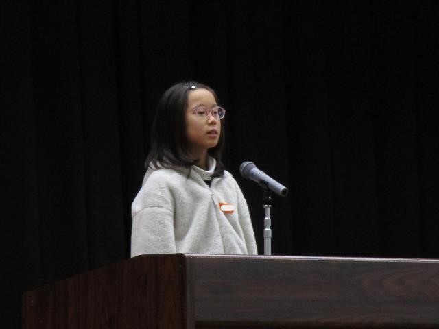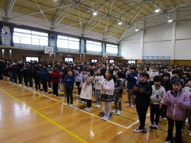 「友達のことば」として、2年生と4年生の児童が3学期に頑張りたいことなどを話しました。「クラスのみんなと仲良くし、楽しい思い出をつくりたい。姿勢よく話を聞き、けじめのある行動をしたい。」「学級委員でなくてもみんなの役に立ちたい。泣いている子や困っている子がいたら、寄り添って優しく接したい。」など、素晴らしい内容でした。全校のみんながそれぞれの目標をもち、充実した3学期にしてほしいと思います。最後に、元気よく校歌を歌いました。