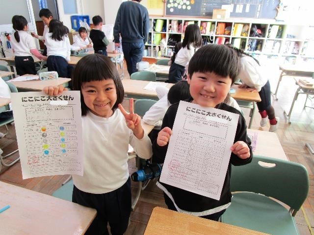 1年生が「にこにこ大さくせん」の発表会をしていました。家族がにこにこになるように、冬休みにお手伝いをしました。どんなお手伝いをしたのか、友達と伝え合いました。
