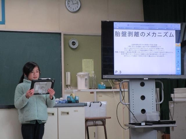 5年生が、理科で「人のたんじょう」について学習し、疑問に思ったことについて調べ、結果を伝え合っていました。「出産を終えると、子宮はどうなるか」「胎盤剥離とは」など、教科書には載っていないことにも興味をもち、調べていました。