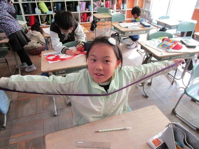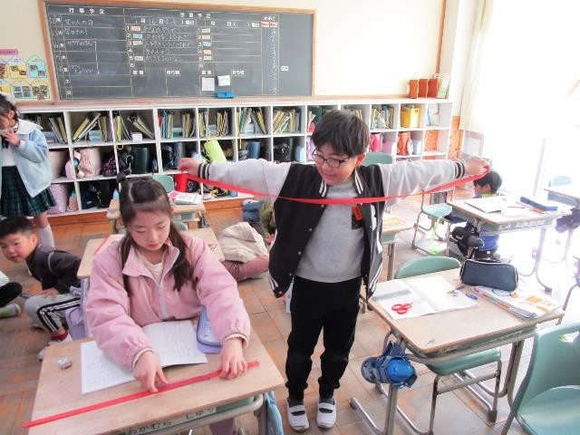 2年生が算数で100cmを超える長さの学習をしていました。紙テープを使って、両手を広げた長さや身近な物の長さを測りました。