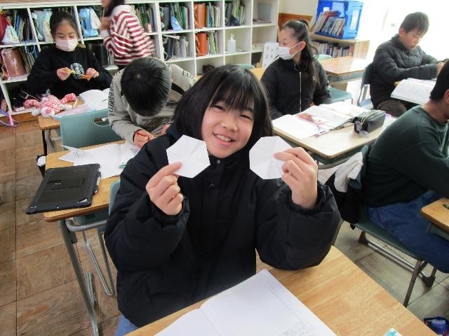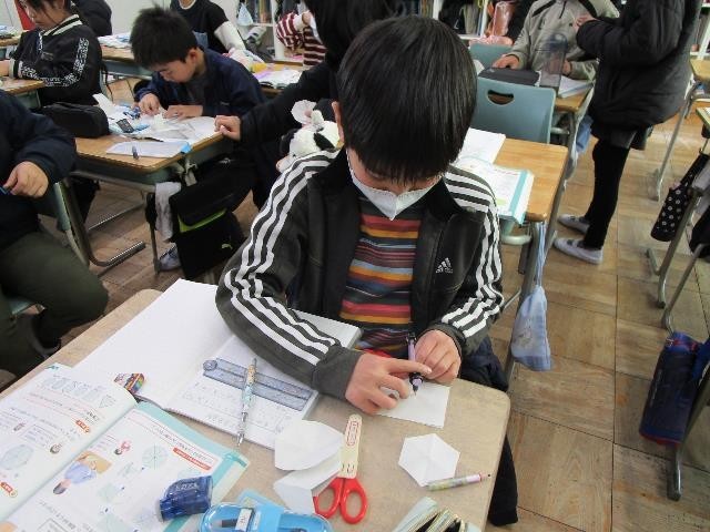 5年生が算数で多角形の学習をしていました。多角形を描いたり、辺や角について調べたりしました。