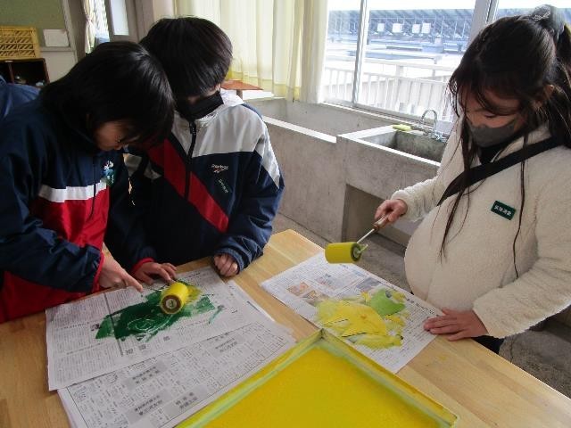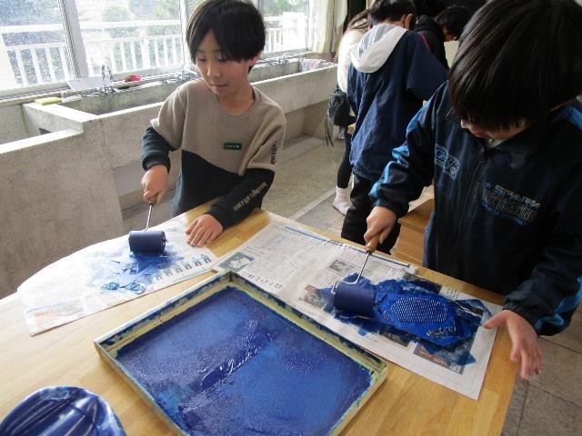 3年生が版画に取り組んでいました。凹凸のある材料を使って動物を作り、インクを塗って刷りました。細かい所まで工夫して版を作り、楽しい作品が出来上がりつつあります。