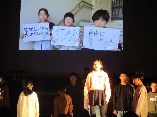 6年生は、「えがこう!~夢いっぱいの未来のわたし~」と題し、わくわく学習で学んだことや、様々な体験を通して思い描いた自分の未来について発表しました。一人一人が自分の将来について発表する場面では、それぞれの真剣な思いが伝わってきました。最後は、おうちの方に素晴らしい歌声を届けました。
