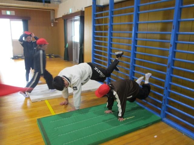 4年生が、体育で倒立の練習をしていました。ろくぼくを使って、腕で体を支える感覚を養いました。続いて、側転に挑戦しました。