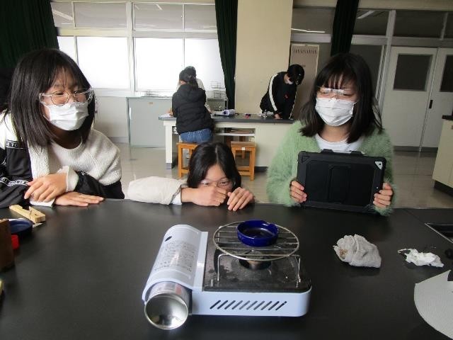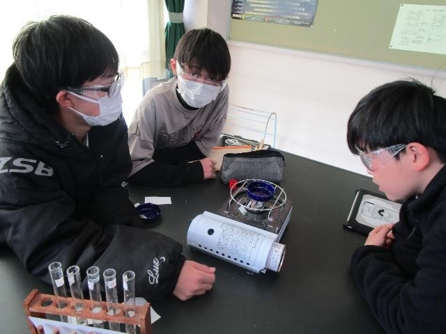 6年生が理科室で実験をしていました。水溶液の様子、におい、熱したときに残るものなどを実験して確かめました。