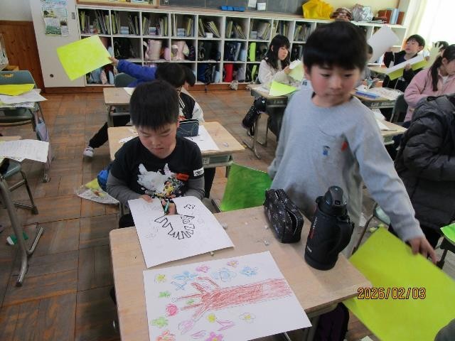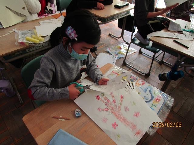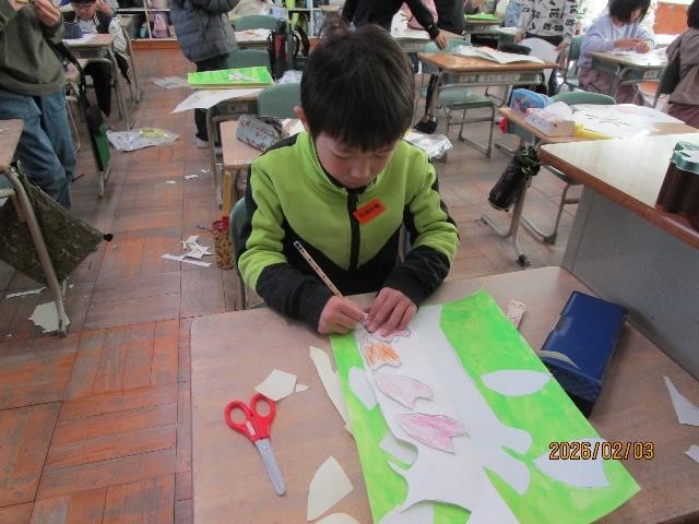 2年生が図画工作でステンシル版画に取り組んでいました。表したいものの形を切り取り、ステンシルのように周りに色を付けていきます。まずは、思い思いに形を切り取りました。