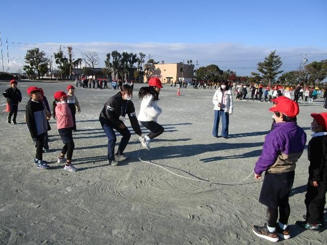 今日からモーニング縄跳びが始まりました。今日は、1・3年生とたんぽぽ組が長縄跳びの八の字跳びに挑戦しました。縄に引っかからないようにタイミングを合わせ、みんなで新記録を目指して頑張りました。