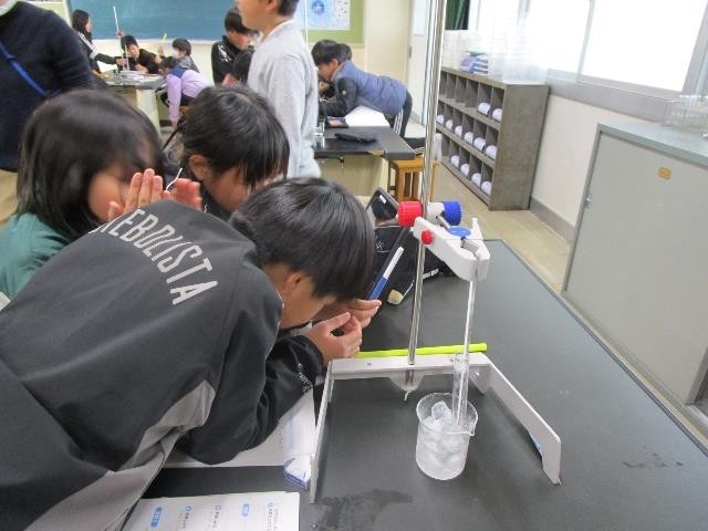 4年生が理科室で実験をしていました。水を冷やすとどうなるか、氷ができ始める温度やさらに冷やすとどうなるかを実験で確かめました。