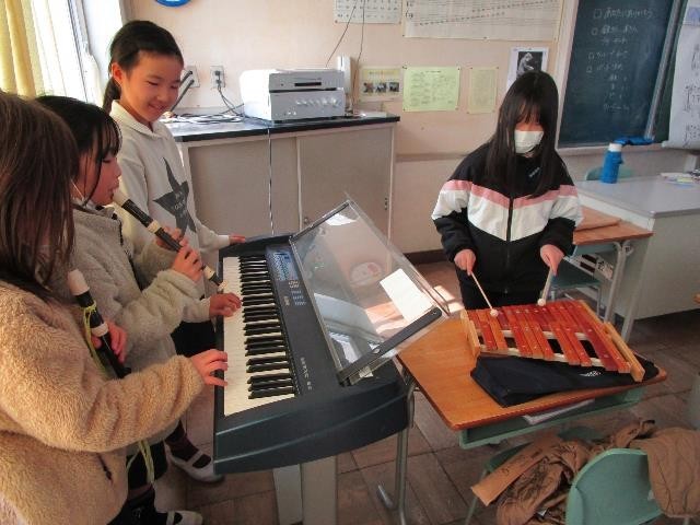 4年生が音楽で合奏の練習をしていました。リコーダー、オルガン、木琴、鉄琴で、「茶色の小びん」という曲の合奏に取り組んでいました。