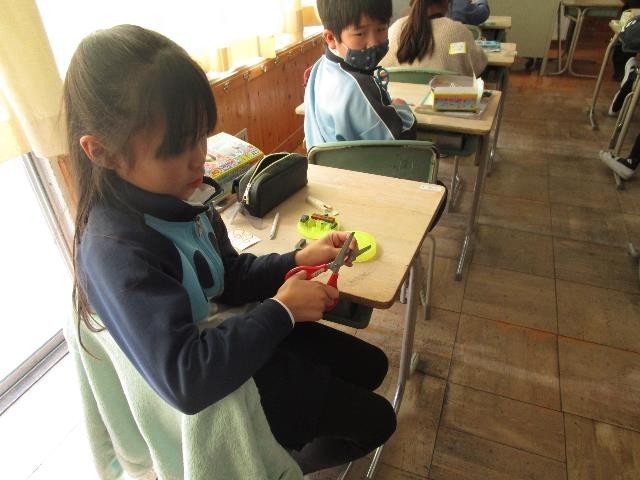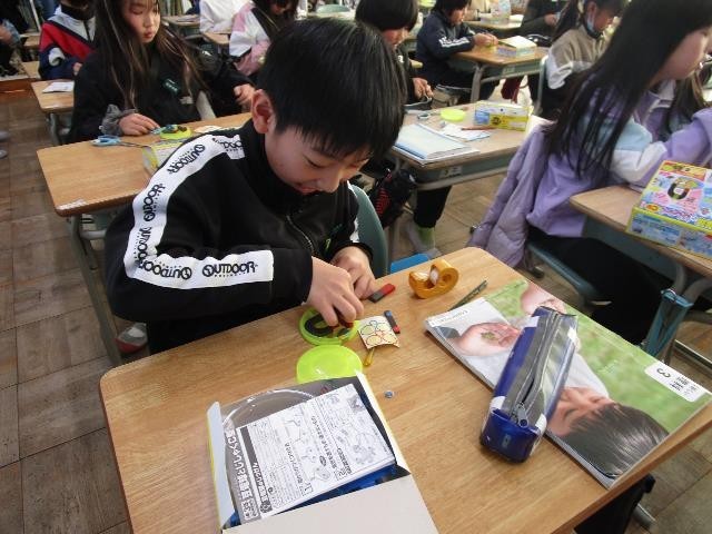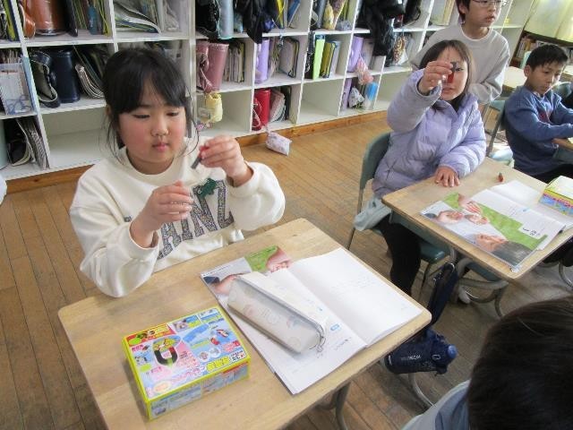 3年生が理科で磁石の学習をしていました。棒磁石やU磁石でS極とN極を確かめました。次にゴム磁石を半分に切ると切り口の極はどうなるか、考えました。