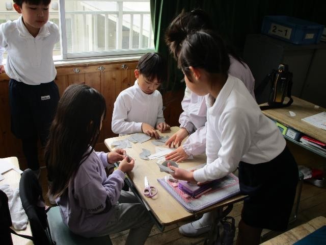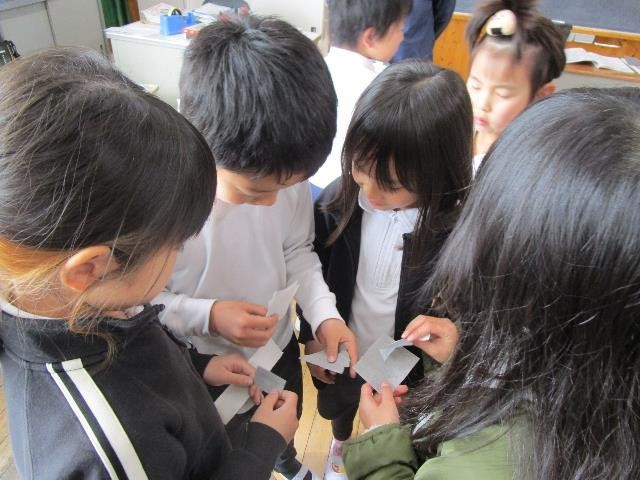 2年生が算数で分数の学習をしていました。いろいろな形の紙を半分に切るという課題について、どんな切り方ができるか友達と一緒に考えました。