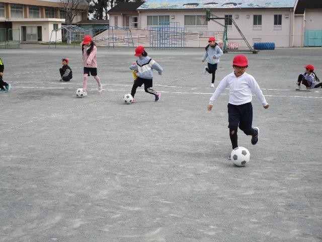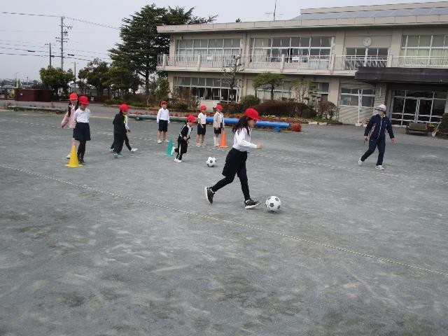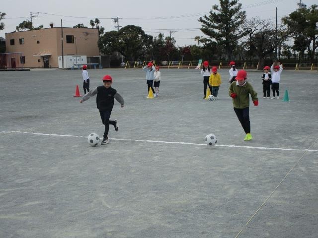 2年生が体育で、サッカーをしていました。ボールを蹴りながら走ったり、相手にパスしたりする練習をしていました。