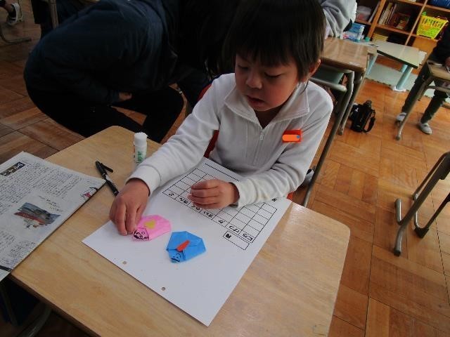 たんぽぽ組のみなさんが、カレンダー作りをしていました。毎回、季節のものを折り紙で作って貼り付けています。3月は、かわいらしいお雛様とお内裏様ができました。