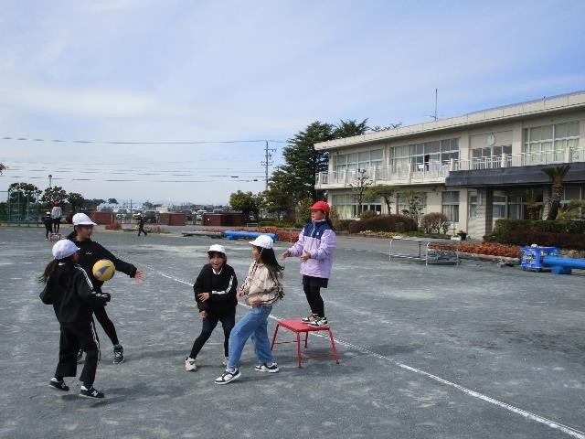 4年生が体育でポートボールをしていました。台の上のゴールマンにボールを渡そうと声をかけ合ってパスを回したり、それを防いだりして、頑張っていました。