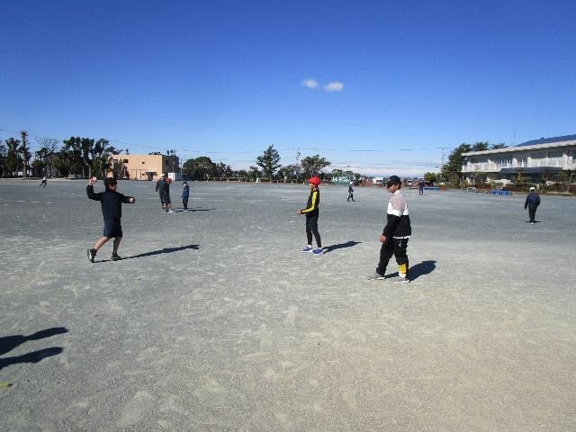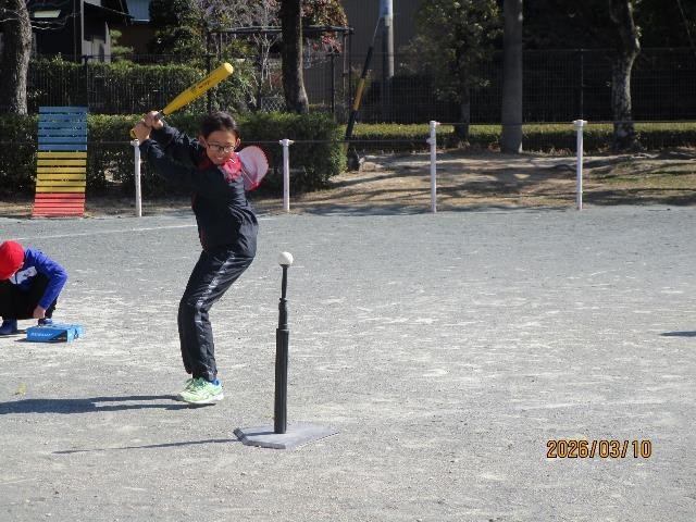 5年生が体育でティーボールをしていました。ティーの上に乗せたボールをバットで打つ、ベースボール型のスポーツです。強い風に負けず、元気よく体を動かしていました。