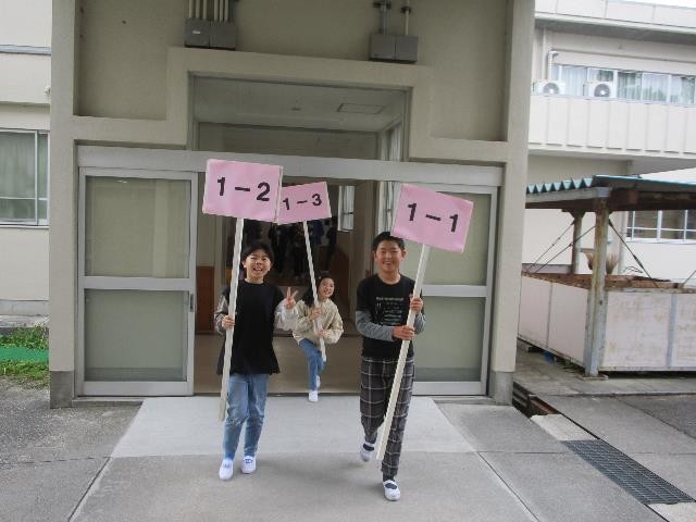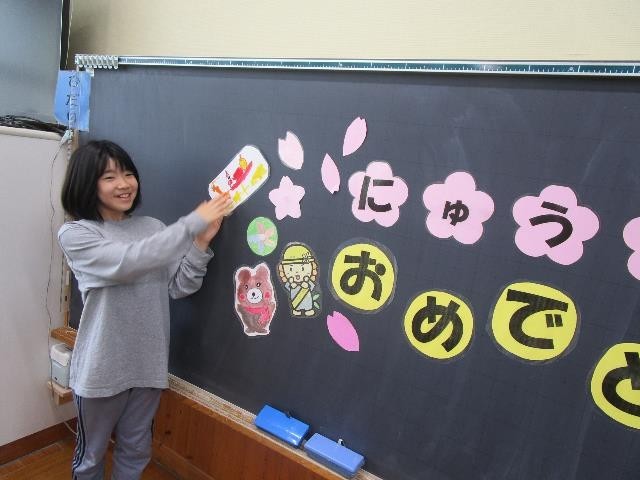 1年生の教室では、黒板にお祝いのメッセージを掲示したり、配付するものを並べたりしました。6年生のおかげで入学式の準備が整いました。明日が楽しみです。