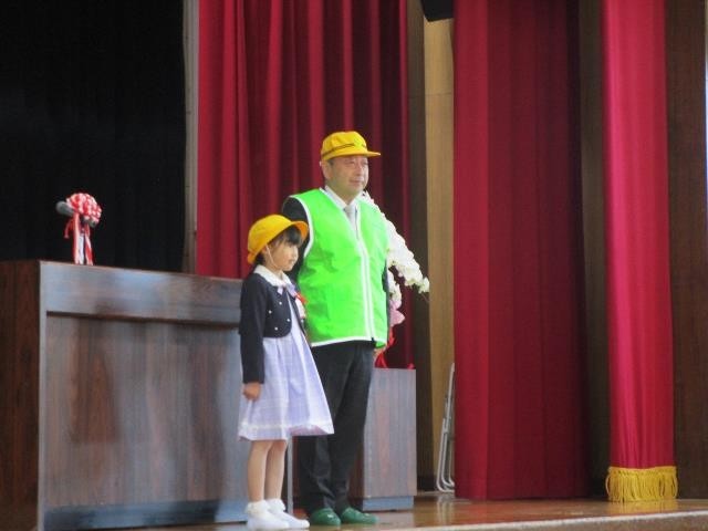 入学式では、PTA会長様より祝辞をいただきました。1年生全員に防犯ブザーのプレゼントもありました。また、神谷様より交通安全帽子を贈呈していただきました。交通事故にあわないようにするために、交通ルールを守ることやお互いに優しく声をかけ合うことの大切さも教えていただきました。6年生の代表児童は、みんなで元気よくあいさつをして、あいさついっぱいの明るい学校にしていきましょうと1年生に呼びかけました。