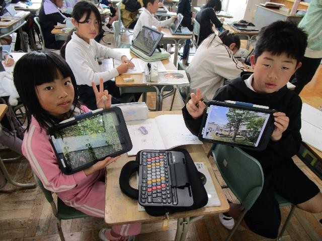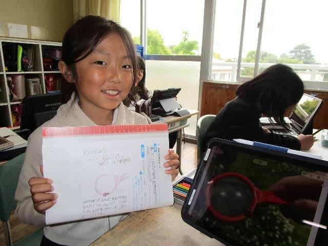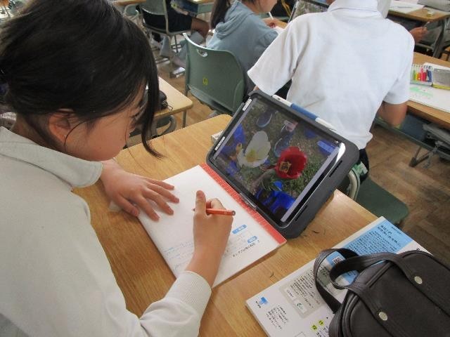 4年生が理科で春の植物や生き物を探し、写真にとってスケッチをしていました。チューリップや草花、昆虫などを見つけていました。