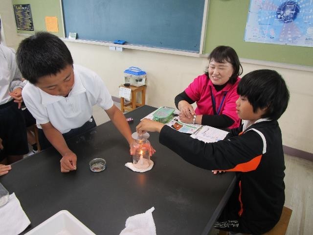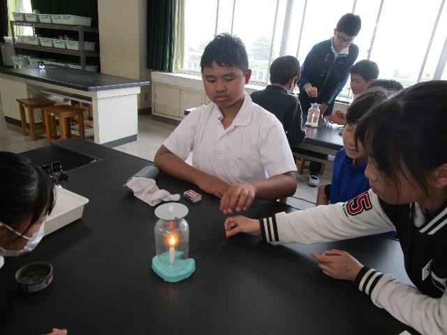 6年生は、理科の時間にろうそくを使った実験をしていました。ろうそくに瓶をかぶせたり、線香の煙を入れたりしながら、ものが燃えているときの様子を調べました。